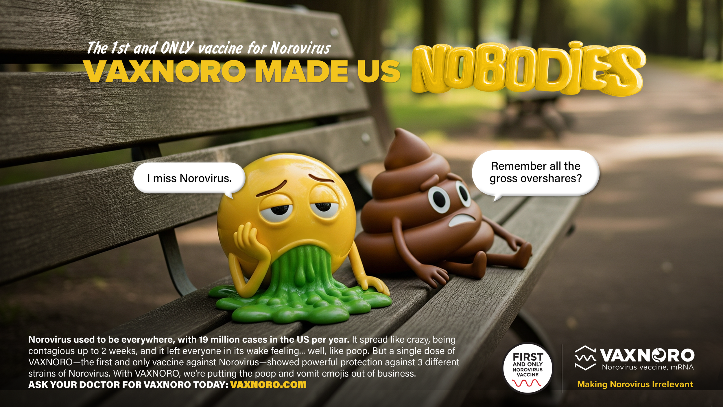 This project began as part of a Moderna pitch to create a direct-to-consumer campaign for norovirus. Our creative strategy leaned into a central truth: norovirus is notoriously awful to endure, but rarely severe and usually brief. People feel intensely sick, just not for long. Research into public perceptions showed that the sheer unpleasantness of the experience leaves little room for traditional messaging—humor emerged as the most natural and effective entry point.